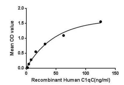 | Bio-activity : | The complement component 1q (C1q) is composed of 18 polypeptide chains: six A-chains, six B-chains, and six C-chains. Complement Component 1, Q Subcomponent C (C1qC) is six C-chains of C1q. Complement component 1q (C1q is a protein complex involved in the complement system, which is part of the innate immune system. C1q together with C1r and C1s form the C1 complex. It is potentially multivalent for attachment to the complement fixation sites of immunoglobulin. The sites are on the CH2 domain of IgG and, it is thought, on the CH4 domain of IgM. IgG4 cannot bind C1q, but the other three IgG types can. Besides, Apolipoprotein A1 (APOA1) has been identified as an interactor of C1qC, thus a binding ELISA assay was conducted to detect the interaction of recombinant human C1qC and recombinant human APOA1. Briefly, C1qC were diluted serially in PBS, with 0.01% BSA (pH 7.4). Duplicate samples of 100μL were then transferred to APOA1-coated microtiter wells and incubated for 2h at 37°C. Wells were washed with PBST and incubated for 1h with anti-C1qC pAb, then aspirated and washed 3 times. After incubation with HRP labelled secondary antibody, wells were aspirated and washed 3 times. With the addition of substrate solution, wells were incubated 15-25 minutes at 37°C. Finally, add 50μL stop solution to the wells and read at 450nm immediately. The binding activity of C1qC and APOA1 was shown in Figure, and this effect was in a dose dependent manner. |