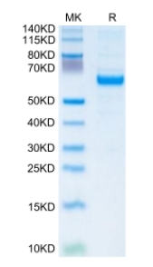Molecular Mass : | The protein has a predicted MW of 44.5 kDa. Due to glycosylation, the protein migrates to 60-70 kDa based on Tris-Bis PAGE result. |