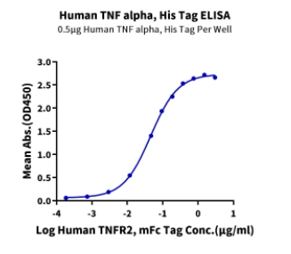 | Bio-activity : | Immobilized Human TNF alpha, His Tag at 5μg/ml (100μl/well) on the plate. Dose response curve for Human TNFR2, mFc Tag with the EC50 of 45.8ng/ml determined by ELISA. |