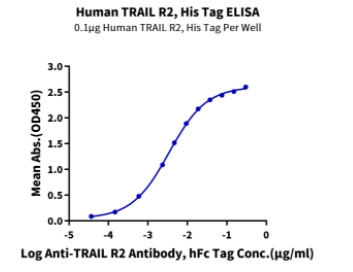 | Bio-activity : | Immobilized Human TRAIL R2, His Tag at 1μg/ml (100μl/Well) on the plate. Dose response curve for Anti-TRAIL R2 Antibody, hFc Tag with the EC50 of 3.4ng/ml determined by ELISA. |
