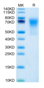 Molecular Mass : | The protein has a predicted MW of 23.5 kDa. Due to glycosylation, the protein migrates to 60-80 kDa based on Tris-Bis PAGE result. |