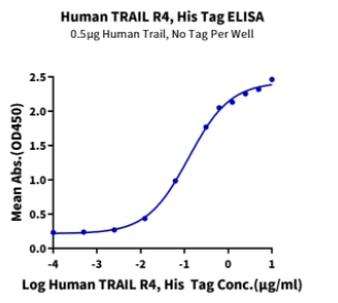 | Bio-activity : | Immobilized Human TRAIL, No Tag at 5ug/ml (100ul/well) on the plate. Dose response curve for Human TRAIL R4, His Tag with the EC50 of 0.13ug/ml determined by ELISA. |