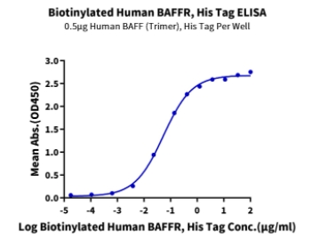 | Bio-activity : | Immobilized Human BAFF (Trimer) , His Tag at 5ug/ml (100ul/well) on the plate. Dose response curve for Biotinylated Human BAFFR, His Tag with the EC50 of 53.5ng/ml determined by ELISA. |