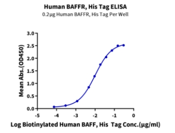 | Bio-activity : | Immobilized Human BAFFR, His Tag at 2μg/ml (100μl/well) on the plate. Dose response curve for Biotinylated Human BAFF, His Tag with the EC50 of 10.1ng/ml determined by ELISA. |