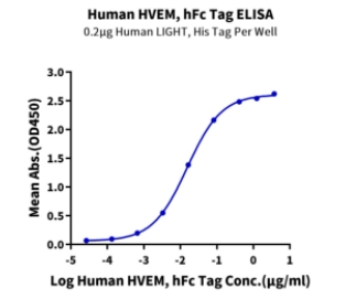 | Bio-activity : | Immobilized Human LIGHT, His Tag at 2 μg/ml (100 μl/Well) on the plate. Dose response curve for Human HVEM, hFc Tag with the EC50 of 15.3 ng/ml determined by ELISA. |