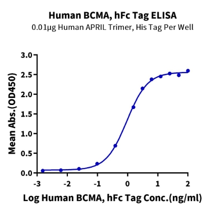| Bio-activity : | Immobilized Human APRIL Trimer, His Tag at 0.1μg/ml (100μl/well) on the plate. Dose response curve for Human BCMA, hFc Tag with the EC50 of 0.9ng/ml determined by ELISA. |