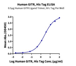 | Bio-activity : | Immobilized Human GITR Ligand Trimer, hFc Tag at 5μg/ml (100μl/well) on the plate. Dose response curve for Human GITR, His Tag with the EC50 of 2.60μg/ml determined by ELISA. |