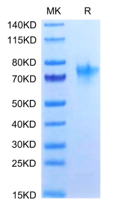 | Molecular Mass : | The protein has a predicted MW of 46.8 kDa. Due to glycosylation, the protein migrates to 70-78 kDa based on Tris-Bis PAGE result. |