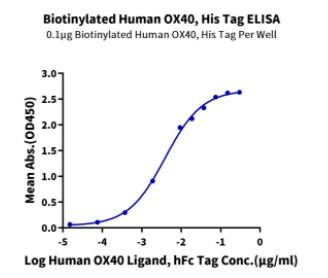 | Bio-activity : | Immobilized Biotinylated Human OX40, His Tag at 1ug/ml (100ul/well) on the streptavidin precoated plate (5ug/ml). Dose response curve for Human OX40 Ligand, hFc Tag with the EC50 of 3.9ng/ml determined by ELISA. |