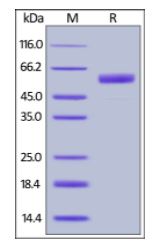Molecular Mass : | The protein has a calculated MW of 43.3 kDa. The protein migrates as 55-60 kDa under reducing (R) condition (SDS-PAGE) due to glycosylation. |