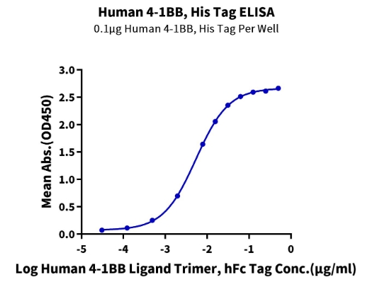 | Bio-activity : | Immobilized Human 4-1BB, His Tag at 1μg/ml (100μl/Well) on the plate. Dose response curve for Human 4-1BB Ligand Trimer, hFc Tag with the EC50 of 5.4ng/ml determined by ELISA. |
