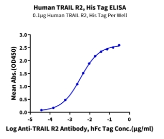 | Bio-activity : | Immobilized Human TRAIL R2, His Tag at 1ug/ml (100ul/Well) on the plate. Dose response curve for Anti-TRAIL R2 Antibody, hFc Tag with the EC50 of 3.4ng/ml determined by ELISA. |