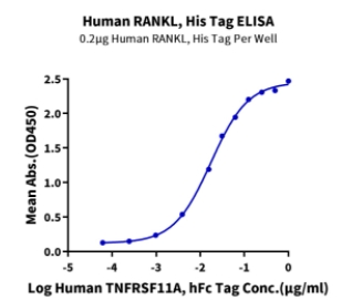 | Bio-activity : | Immobilized Human RANKL, His Tag at 2ug/ml (100ul/well) on the plate. Dose response curve for Human TNFRSF11A, hFc Tag with the EC50 of 17.4ng/ml determined by ELISA. |