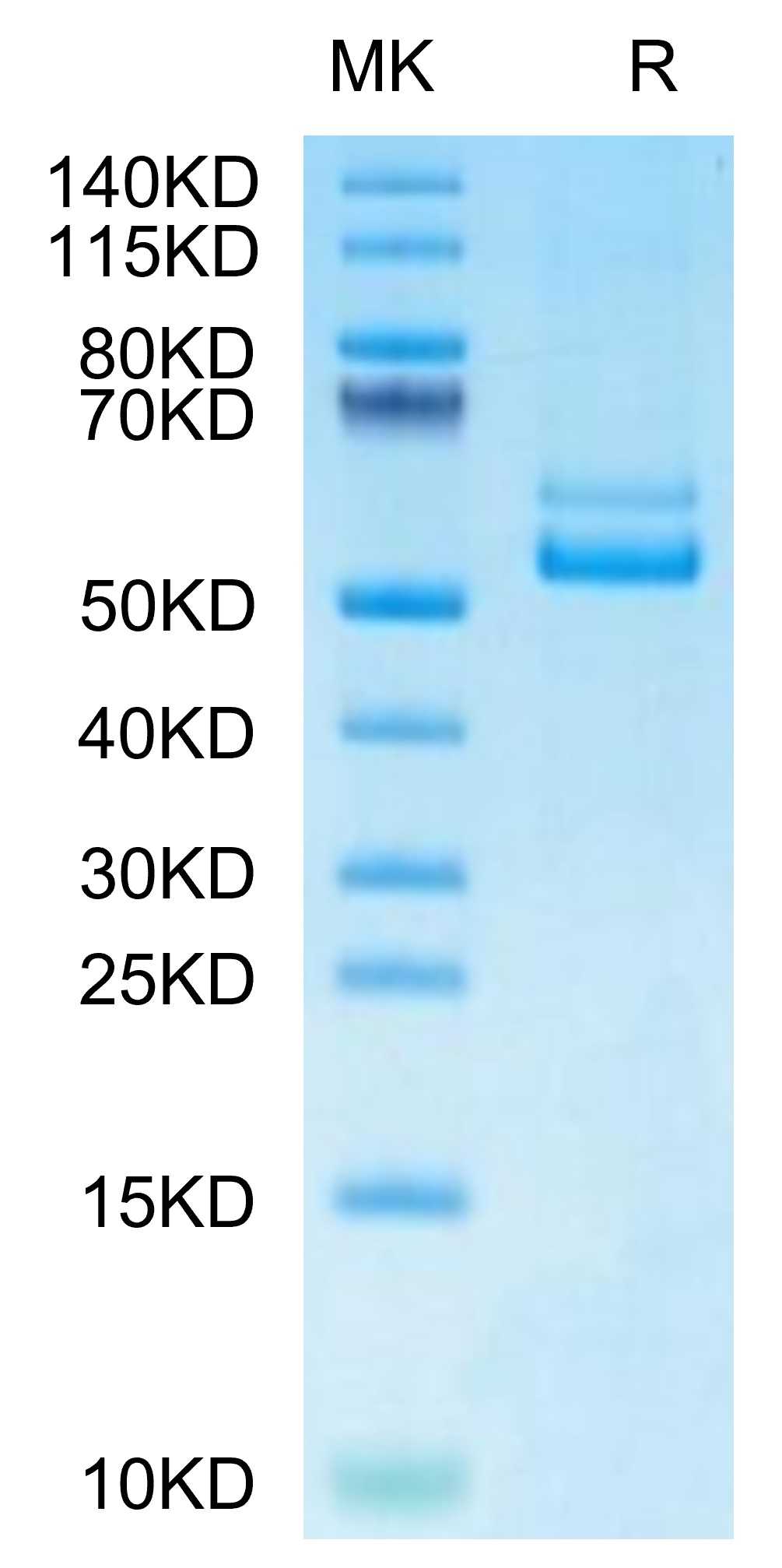 | Molecular Mass : | The protein has a predicted MW of 49.62 kDa. Due to enzyme lysis and glycosylation, the protein migrates to 50-60 kDa based on Tris-Bis PAGE result. |