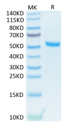 | Molecular Mass : | The protein has a predicted MW of 52.05 kDa. Due to glycosylation, the protein migrates to 52-60 kDa based on Tris-Bis PAGE result. |