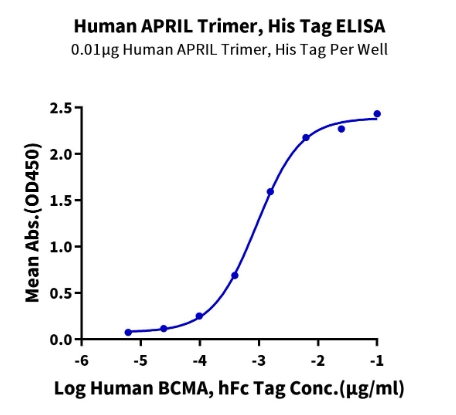 | Bio-activity : | Immobilized Human APRIL Trimer, His Tag at 0.1μg/ml (100μl/well) on the plate. Dose response curve for Human BCMA, hFc Tag with the EC50 of 0.9ng/ml determined by ELISA. |