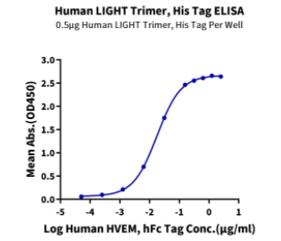 | Bio-activity : | Immobilized Human LIGHT Trimer, His tag at 5μg/ml (100 μl/well) on the plate. Dose response curve for Human HVEM, hFc Tag with the EC50 of 17.7ng/ml determined by ELISA. |
