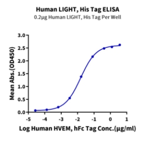 | Bio-activity : | Immobilized Human LIGHT, His Tag at 2 μg/ml (100 μl/Well) on the plate. Dose response curve for Human HVEM, hFc Tag with the EC50 of 15.3 ng/ml determined by ELISA. |
