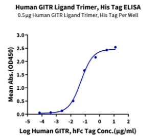 | Bio-activity : | Immobilized Human GITR Ligand Trimer, His Tag at 5ug/ml (100ul/well) on the plate. Dose response curve for Human GITR, hFc Tag with the EC50 of 50.8ng/ml determined by ELISA. |