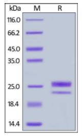 Molecular Mass : | The protein has a calculated MW of 20.5 kDa. The protein migrates as 23 kDa and 26 kDa under reducing (R) condition (SDS-PAGE) due to glycosylation. |