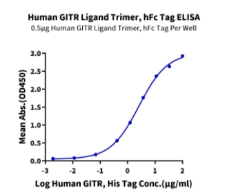 | Bio-activity : | Immobilized Human GITR Ligand Trimer, hFc Tag at 5μg/ml (100μl/well) on the plate. Dose response curve for Human GITR, His Tag with the EC50 of 2.60μg/ml determined by ELISA. |