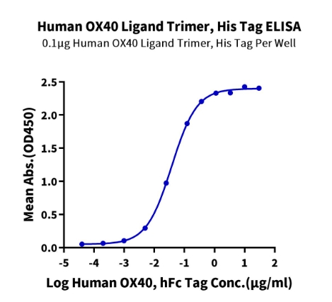 | Bio-activity : | Immobilized Human OX40 Ligand Trimer, His Tag at 1μg/ml (100μl/well) on the plate. Dose response curve for Human OX40, hFc Tag with the EC50 of 37.7ng/ml determined by ELISA. |