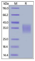 Molecular Mass : | The protein has a calculated MW of 21.5 kDa. The protein migrates as 30-40 kDa under reducing (R) condition (SDS-PAGE) due to glycosylation. |