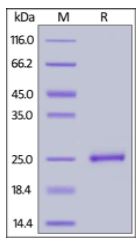 Molecular Mass : | The protein has a calculated MW of 23.3 kDa. The protein migrates as 25 kDa under reducing (R) condition (SDS-PAGE) due to glycosylation. |