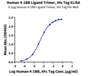 | Bio-activity : | Immobilized Human 4-1BB Ligand Trimer, His Tag at 2μg/ml (100μl/well) on the plate. Dose response curve for Human 4-1BB, hFc Tag with the EC50 of 4.6ng/ml determined by ELISA. |