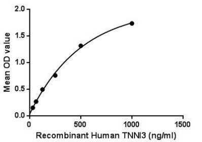 Troponin I Type 3, Cardiac (TNNI3) is a protein that in humans is encoded by the TNNI3 gene. It is a tissue-specific subtype of troponin I, which in turn is a part of the troponin complex. The TNNI3 gene encoding cardiac troponin I (cTnI) is located at 19q13.4 in the human chromosomal genome. Human cTnI is a 24kDa protein consisting of 210 amino acids with isoelectric point (pI) of 9.87. cTnI is exclusively expressed in adult cardiac muscle. Besides, Troponin T Type 2, Cardiac (TNNT2) has been identified as an interactor of TNNI3, thus a binding ELISA assay was conducted to detect the interaction of recombinant human TNNI3 and recombinant human TNNT2. Briefly, TNNI3 was diluted serially in PBS with 0.01% BSA (pH 7.4). Duplicate samples of 100μL were then transferred to TNNT2-coated microtiter wells and incubated for 2h at 37°C. Wells were washed with PBST and incubated for 1h with anti-TNNI3 pAb, then aspirated and washed 3 times. After incubation with HRP labelled secondary antibody, wells were aspirated and washed 3 times. With the addition of substrate solution, wells were incubated 15-25 minutes at 37°C. Finally, add 50µL stop solution to the wells and read at 450nm immediately. The binding activity of TNNI3 and TNNT2 was shown, and this effect was in a dose dependent manner. |