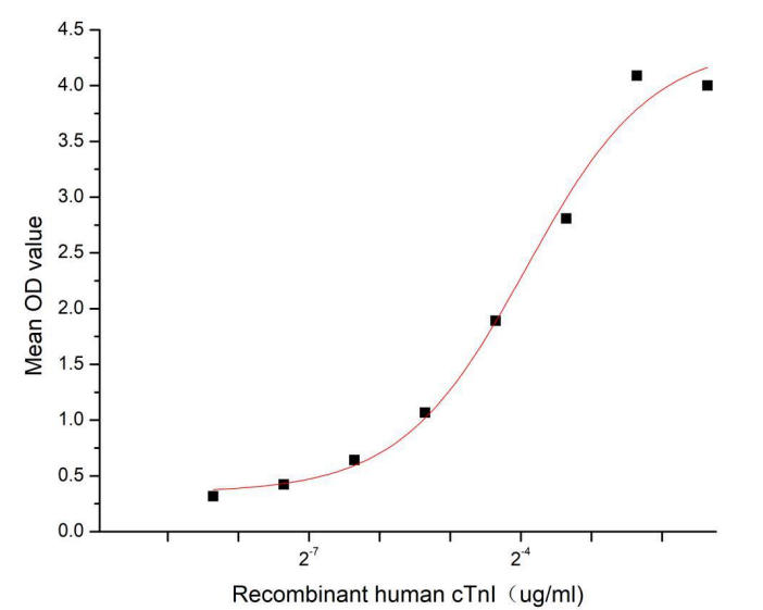 | Bio-activity : | Cardiac Troponin I (cTnI), as a cytoplasmic protein, is one of the most important regulatory proteins part of the troponin-tropomyosin complex localized on the actin (thin) myofilaments in cardiac myocytes.It is the inhibitory subunit of troponin, the thin filament regulatory complex which confers calcium-sensitivity to striated muscle actomyosin ATPase activity.Besides,Actin Alpha 1, Cardiac Muscle (ACTC1) has been identified as an interactor of cTnI, thus a functional binding ELISA assay was conducted to detect the interaction of recombinant human cTnI and recombinant human ACTC1. Briefly, biotin-linked cTnI were diluted serially in PBS, with 0.01% BSA (pH 7.4). Duplicate samples of 100 μ l were then transferred to ACTC1-coated microtiter wells and incubated for 1h at 37°C. Wells were washed with PBST 3 times and incubation with Streptavidin-HRP for 30min, then wells were aspirated and washed 5 times. With the addition of substrate solution, wells were incubated 15-25 minutes at 37°C. Finally, add 50µl stop solution to the wells and read at 450nm immediately. The binding activity of cTnI and ACTC1 was shown, the EC50 for this effect is 0.066ug/mL. |