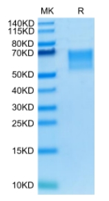 Molecular Mass : | The protein has a predicted MW of 38.2 kDa. Due to glycosylation, the protein migrates to 50-70 kDa based on Tris-Bis PAGE result. |