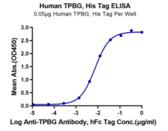 | Bio-activity : | Immobilized Human TPBG, His Tag at 0.5 μg/ml (100 μl/Well) on the plate. Dose response curve for Anti-TPBG Antibody, hFc Tag with the EC50 of 7.3 ng/ml determined by ELISA. |