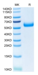 The protein has a predicted MW of 44.2 kDa. Due to glycosylation, the protein migrates to 50-70 kDa based on Tris-Bis PAGE result. |