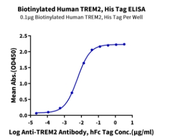 | Bio-activity : | Immobilized Biotinylated Human TREM2, His Tag at 1ug/ml (100ul/Well) on streptavidin (5ug/ml) precoated plate. Dose response curve for Anti-TREM2 Antibody, hFc Tag with the EC50 of 5.8ng/ml determined by ELISA. |