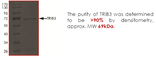 | Product Overview : | Recombinant full-length human TRIB3 was expressed by baculovirus in Sf9 insect cells using an N-terminal GST tag. |
