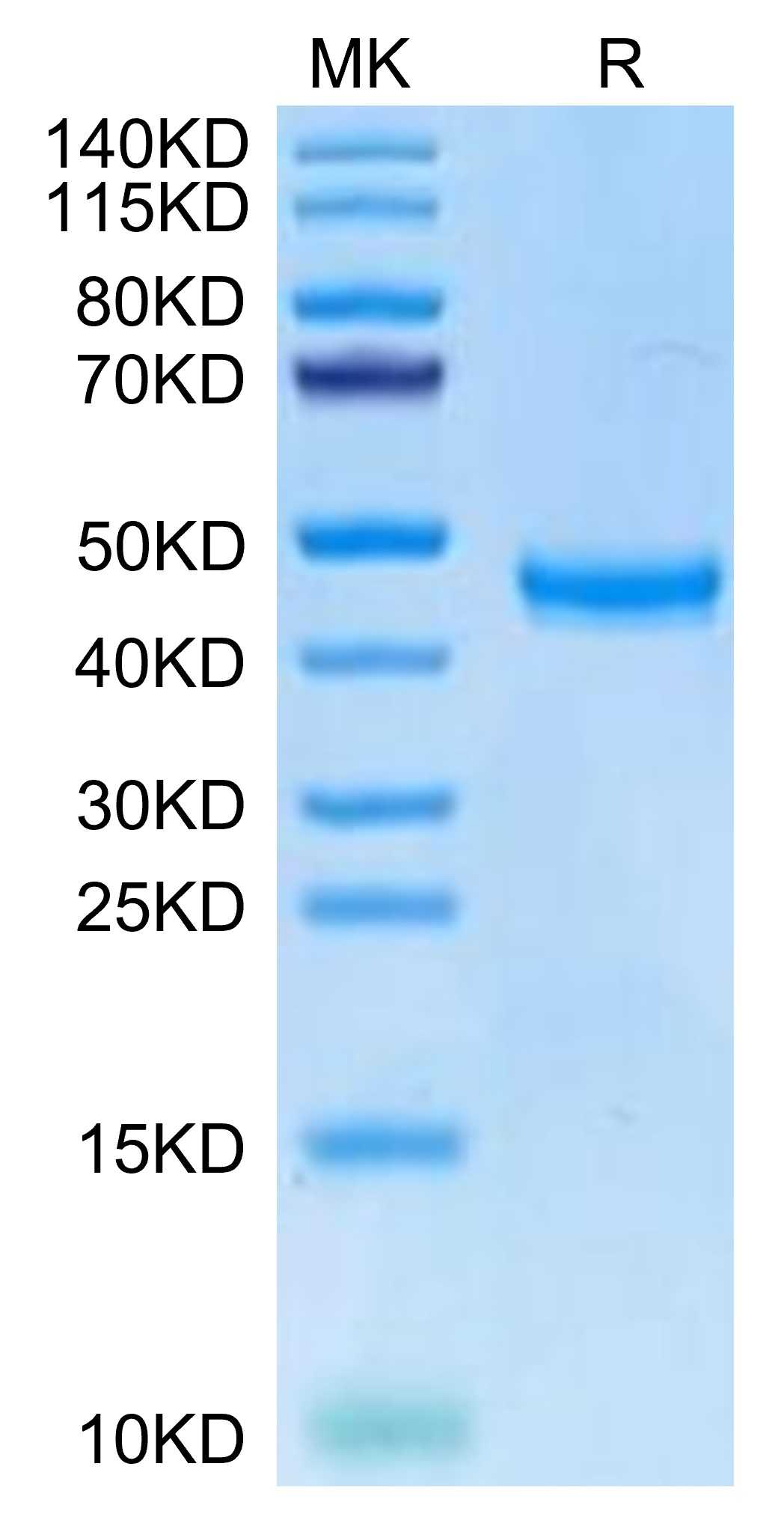 | Molecular Mass : | The protein has a predicted MW of 37.30 kDa. Due to glycosylation, the protein migrates to 43-48 kDa based on Tris-Bis PAGE result. |