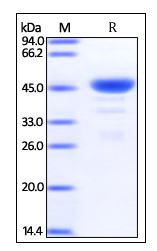 | Molecular Mass : | The protein has a calculated MW of 47.6 kDa. The protein migrates as 45 kDa under reducing (R) condition (SDS-PAGE). |