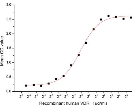 Vitamin D Receptor (VDR) is the nuclear hormone receptor for vitamin D3. The receptor belongs to the family of trans-acting transcriptional regulatory factors and shows sequence similarity to the steroid and thyroid hormone receptors. It mediates the action of vitamin D3 by controlling the expression of hormone sensitive genes. Besides, Retinoid X Receptor Alpha (RXRa) has been identified as an interactor of VDR, thus a binding ELISA assay was conducted to detect the interaction of recombinant human VDR and recombinant human RXRa. Briefly, VDR were diluted serially in PBS, with 0.01% BSA (pH 7.4). Duplicate samples of 100 ul were then transferred to RXRa-coated microtiter wells and incubated for 1h at 37°C. Wells were aspirated and incubated for 1h with anti-VDR pAb, then aspirated and washed 3 times. After incubation with HRP labelled secondary antibody, wells were aspirated and washed 5 times. With the addition of substrate solution, wells were incubated 15-25 minutes at 37°C. Finally, add 50 µL stop solution to the wells and read at 450nm immediately. The binding activity of of VDR and RXRa was shown, and this effect was in a dose dependent manner. The EC50 for this effect is 0.469 ug/mL. |