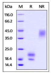 Molecular Mass : | The protein has a calculated MW of 14 kDa (monomer). As a result of glycosylation, the protein migrates as 19 kDa and 20kDa under reducing (R) condition, and 40-45 kDa (homodimer) under non-reducing (NR) condition (SDS-PAGE). |