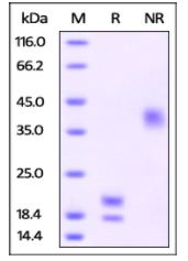 Molecular Mass : | The protein has a calculated MW of 15.0 kDa. As a result of glycosylation, the protein migrates as 17 kDa and 20 kDa under reducing (R) condition, and 35-45 kDa under non-reducing (NR) condition (SDS-PAGE). |