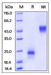 Molecular Mass : | The protein has a calculated MW of 19.0 kDa (monomer). As a result of glycosylation, the protein migrates as 24 kDa (monomer) under reducing (R) condition, and 43-50 kDa (homodimer) under non-reducing (NR) condition (SDS-PAGE). |