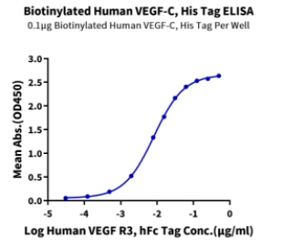 | Bio-activity : | Immobilized Biotinylated Human VEGF-C, His Tag at 1ug/ml (100ul/well) on the streptavidin precoated plate (5ug/ml). Dose response curve for Human VEGF R3, hFc Tag with the EC50 of 8.2ng/ml determined by ELISA. |