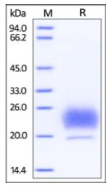 Molecular Mass : | The protein has a calculated MW of 10.9 kDa. The protein migrates as 19 kDa and 22-26 kDa under reducing (R) condition (SDS-PAGE) due to different glycosylation. |