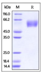 | Molecular Mass : | The protein has a calculated MW of 37.5 kDa. The protein migrates as 50-66 kDa under reducing (R) condition (SDS-PAGE) due to glycosylation. |