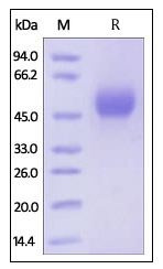 | Molecular Mass : | The protein has a calculated MW of 37.5 kDa. The protein migrates as 43-50 kDa under reducing (R) condition (SDS-PAGE). |