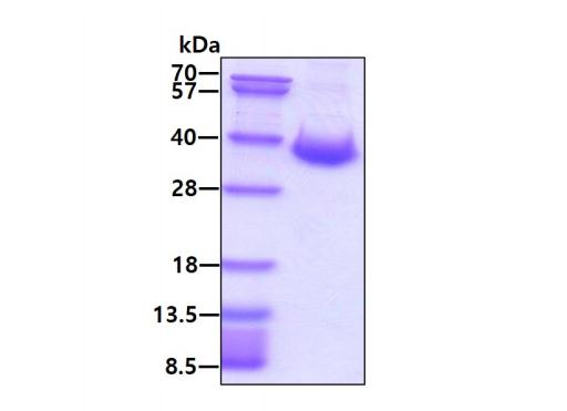 | Description : | MERS-CoV, which causes the Middles East Respiratory Syndrome (MERS), belongs to a family of viruses known as coronaviruses. MERS-CoV was first identified in the Kingdom of Saudi Arabia in 2012, which is a single and positive stranded RNA virus. Dromedary camels are widely considered as the source of the transmission of MERS-CoV. The rate of human transmission among household contacts of MERS patients has been approximately 5 % based on serological analysis. MERS-CoV has four structural proteins, known as the S (spike), E (envelope), M (membrane), and N (nucleocapsid) proteins. The spike protein, responsible for allowing the virus to attach to and fuse with the membrane of a host cell and is a large type I transmembrane protein containing two subunits, S1 and S2. S1 mainly contains a receptor binding domain (RBD), which is responsible for recognizing the cell surface receptor. S2 contains basic elements needed for the membrane fusion. MERS-CoV S mediates viral attachment and fusion to human cells via human cellular receptor DPP4, also known as CD26. The S protein plays key parts in the induction of neutralizing-antibody and T-cell responses, as well as protective immunity. Recombinant MERS-CoV Spike RBD, fused to His-tag at C-terminus, was expressed in insect cell and purified by using conventional chromatography techniques. |