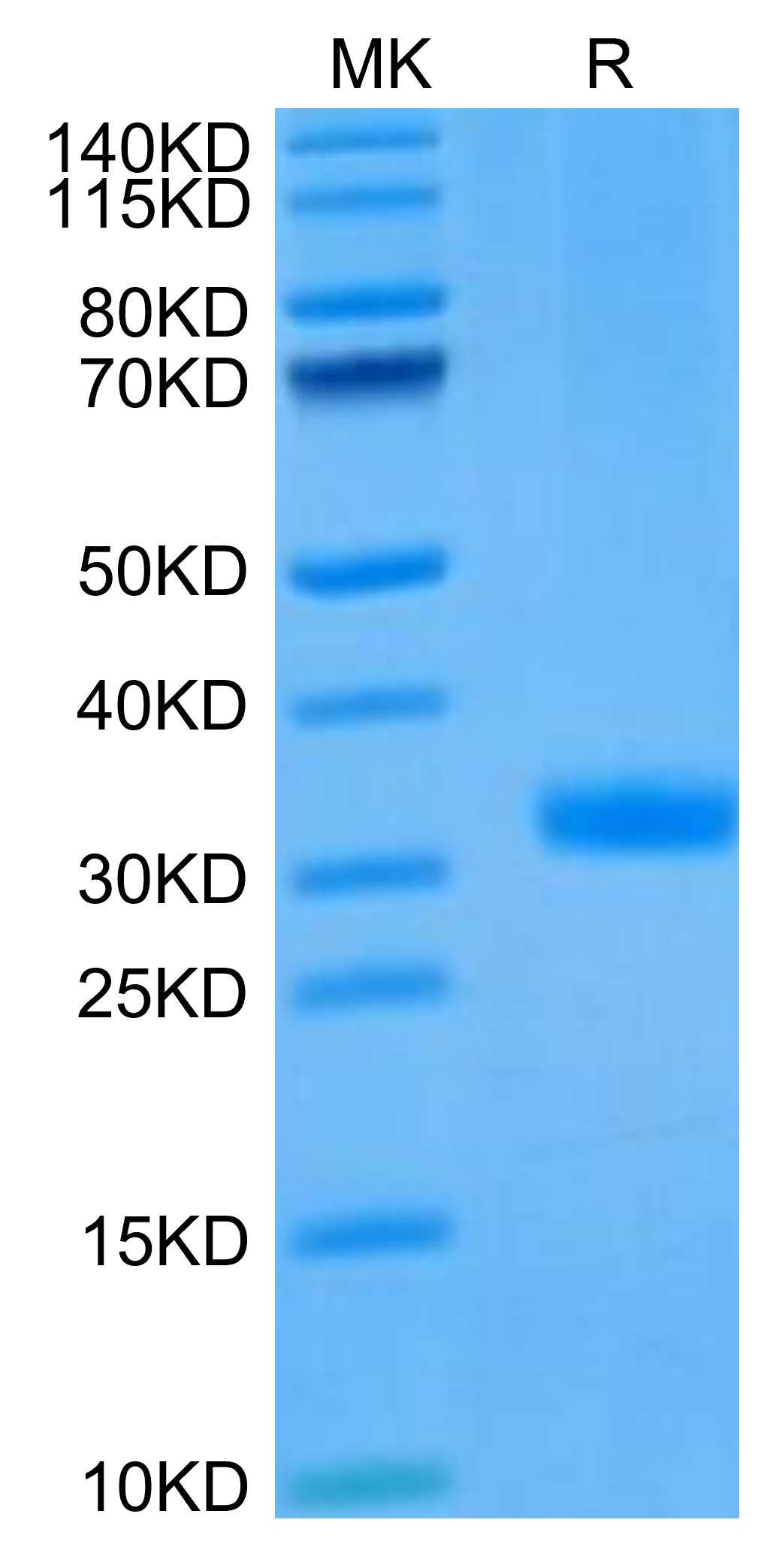 Molecular Mass : | The protein has a predicted MW of 26.29 kDa. Due to glycosylation, the protein migrates to 30-35 kDa based on Tris-Bis PAGE result. |