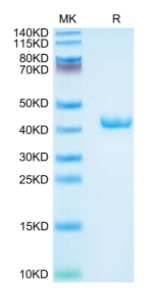 Molecular Mass : | The protein has a predicted MW of 36.2 kDa. Due to glycosylation, the protein migrates to 40-45 kDa based on Tris-Bis PAGE result. |