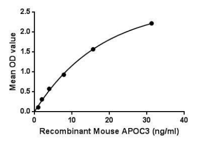 of triglyceride-rich VLDL particles from hepatic cells under lipid-rich conditions. Besides, Prenylcysteine Oxidase 1 (PCYOX1) has been identified as an interactor of APOC3, thus a binding ELISA assay was conducted to detect the interaction of recombinant mouse APOC3 and recombinant mouse PCYOX1. Briefly, APOC3 were diluted serially in PBS, with 0.01% BSA (pH 7.4). Duplicate samples of 100μL were then transferred to PCYOX1-coated microtiter wells and incubated for 2h at 37°C. Wells were washed with PBST and incubated for 1h with anti-APOC3 pAb, then aspirated and washed 3 times. After incubation with HRP labelled secondary antibody, wells were aspirated and washed 3 times. With the addition of substrate solution, wells were incubated 15-25 minutes at 37°C. Finally, add 50µL stop solution to the wells and read at 450nm immediately. The binding activity of APOC3 and PCYOX1 was in a dose dependent manner. |